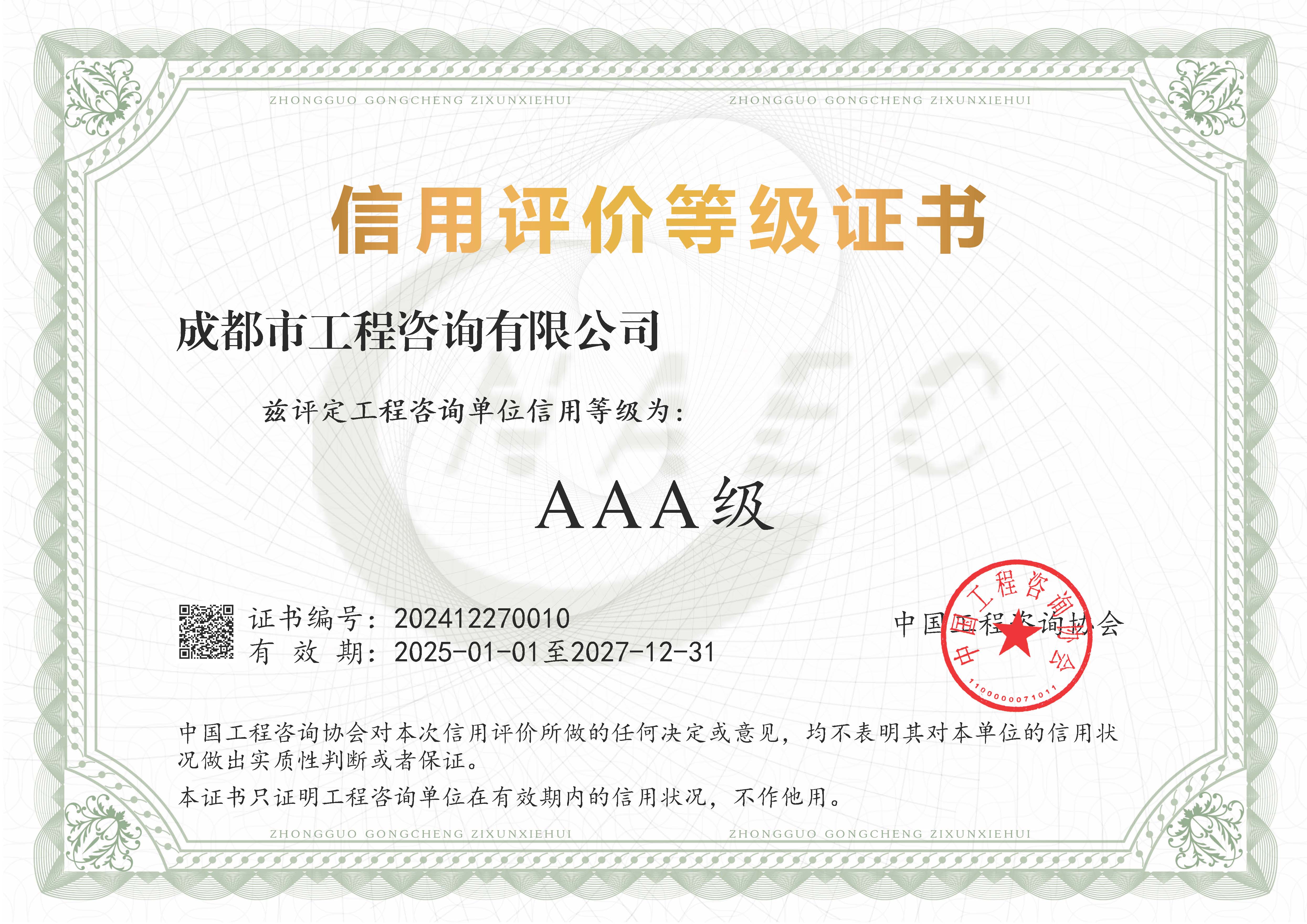 公司擁有工程咨詢甲級綜合資信、甲級專業(yè)資信和PPP甲級專項(xiàng)資信三項(xiàng)甲級資信證書和工程造價(jià)資質(zhì)。甲級綜合資信由建筑,水利水電,農(nóng)業(yè)、林業(yè),電子、信息工程(含通信、廣電、信息化),市政公用工程,生態(tài)建設(shè)和環(huán)境工程,公路,其他(節(jié)能)8個(gè)甲級專業(yè)資信和電力(含火電、水電、核電、新能源),輕工、紡織,水文地質(zhì)、工程測量、巖土工程,建材,鐵路、城市軌道交通,其他(土地整理)和其他(旅游工程)7個(gè)其他專業(yè)組成。公司現(xiàn)已通過了GB/T19001-2016/ISO9001:2015質(zhì)量管理體系、GB/T24001-2016/ISO14001:2015環(huán)境管理體系和GB/T45001-2020/ISO45001:2018職業(yè)健康安全管理體系認(rèn)證。公司目前是四川省內(nèi)唯一同時(shí)持有甲級綜合資信、甲級專業(yè)資信和PPP甲級專項(xiàng)資信證書的綜合性咨詢機(jī)構(gòu),是四川省及成都市發(fā)展改革部門以及天府新區(qū)、東部新區(qū)、高新區(qū)、武侯區(qū)等20余個(gè)區(qū)(市)縣的政府投資項(xiàng)目咨詢服務(wù)機(jī)構(gòu)。