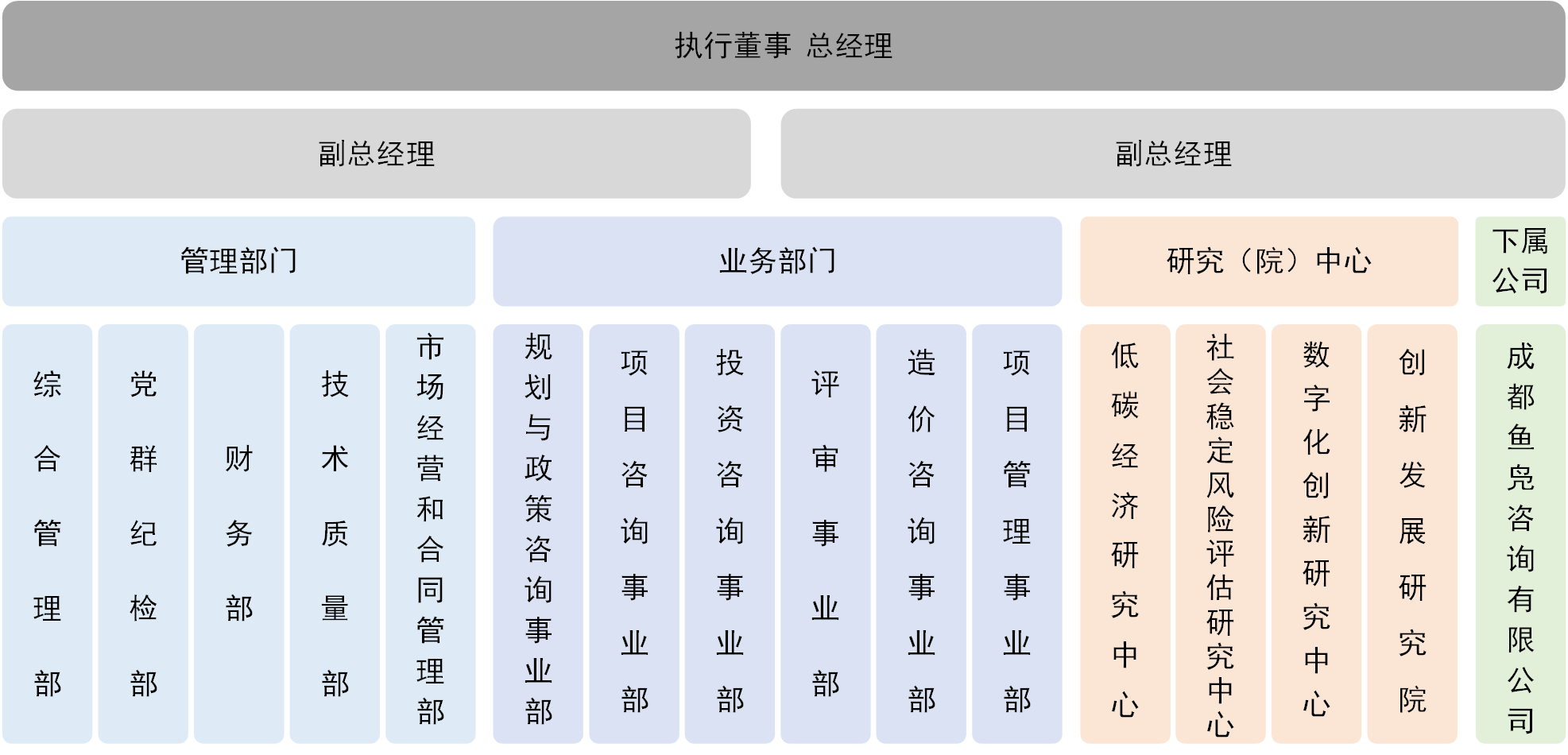 公司本科及以上學(xué)歷員工占比93%,碩士及以上學(xué)歷員工占比47%;正高級工程師7人,高級工程師28人,擁有全國咨詢工程師(投資)、全國注冊造價(jià)工程師以及注冊城鄉(xiāng)規(guī)劃師等各類專業(yè)技術(shù)資格人才占比超過65%。公司下設(shè)11個(gè)部門,4個(gè)研究(院)中心。其中,業(yè)務(wù)部門6個(gè),包括規(guī)劃與政策咨詢事業(yè)部、項(xiàng)目咨詢事業(yè)部、投資咨詢事業(yè)部、評審事業(yè)部、造價(jià)咨詢事業(yè)部和項(xiàng)目管理事業(yè)部;4個(gè)研究(院)中心分別為低碳經(jīng)濟(jì)研究中心、社會穩(wěn)定風(fēng)險(xiǎn)評估研究中心、數(shù)字化創(chuàng)新研究中心和創(chuàng)新發(fā)展研究院。為推動(dòng)行業(yè)數(shù)字化、智能化轉(zhuǎn)型發(fā)展,公司還與西南交通大學(xué)經(jīng)濟(jì)管理學(xué)院共建工程咨詢智能決策研究中心和產(chǎn)學(xué)研合作示范研究基地。公司現(xiàn)有控股子公司1家,為公司與溫江區(qū)屬國有公司合資成立的成都魚鳧咨詢有限公司。
